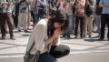 横断歩道のど真ん中に、ひざをつき、頭を下げはじめる女性。